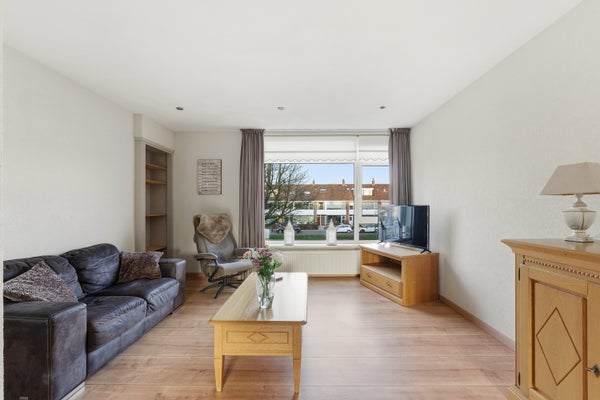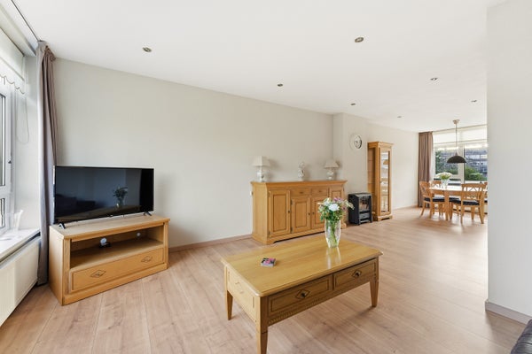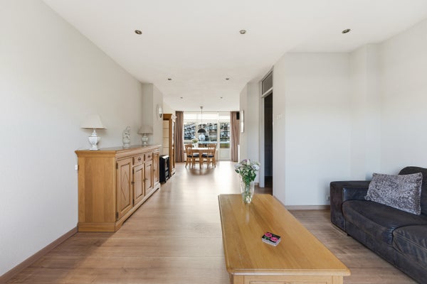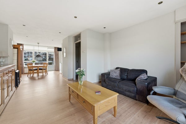 Riante woonkamer (34m2) met fijn hoog plafond en prachtige vloer uit 2025, negen-en-een-halve meter lang en aan de singelzijde ruim 4 meter breed. Balkon met zon tot 15:00 en vrij uitzicht over de tuinen.