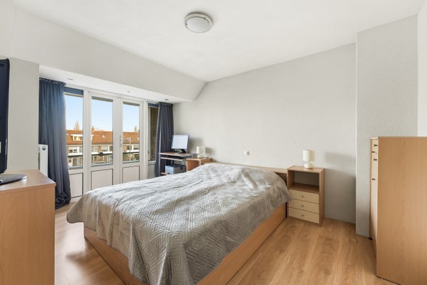 Slaapverdieping met overloop, 3 goede slaapkamers (10, 13 en 7m2) en voorbalkon met zon tot het eind van de dag en uitzicht over de singel.