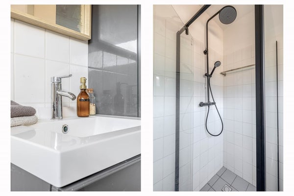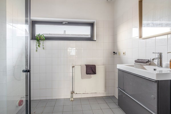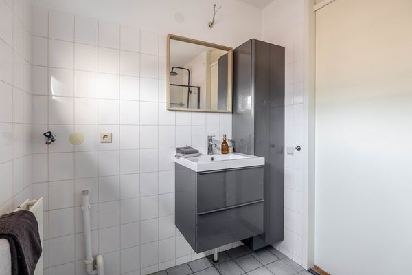 De badkamer is simpel maar functioneel uitgevoerd en voorzien van een inloopdouche, wastafel en wasmachineaansluiting. Daarnaast is er een aparte bergkast waar de CV-ketel netjes is opgesteld.