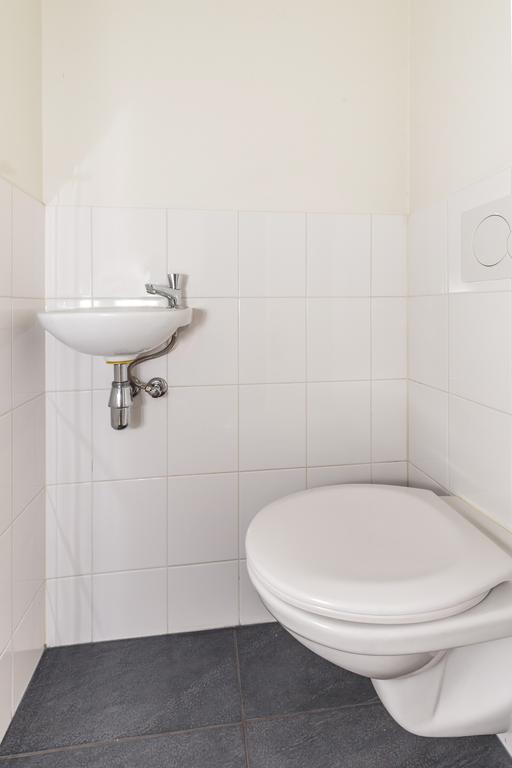 - Deels betegeld toilet met zwevend closet en fontein.