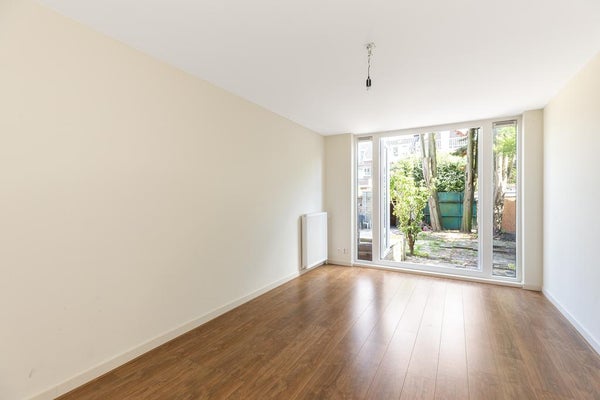 en een kast voor de combiketel. - Tuingerichte woonkamer voorzien van een laminaatvloer, nette wand- en plafondafwerking en openslaande deuren