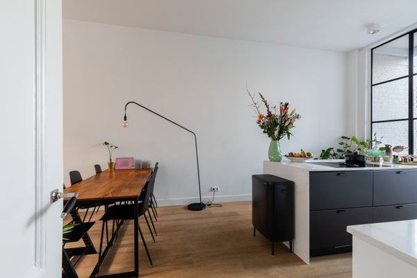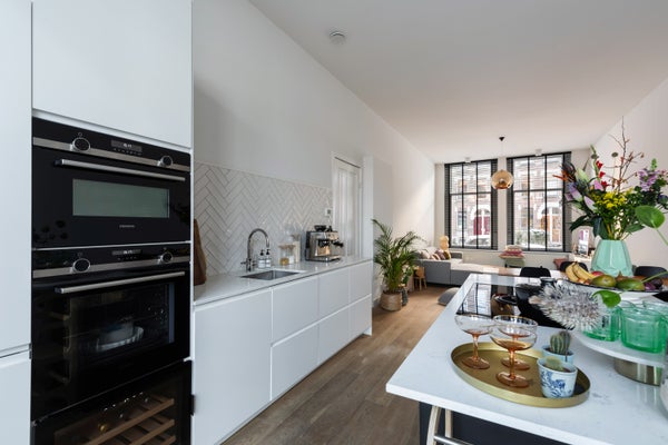 Via de eigen entree kom je binnen in een stijlvolle hal met toilet en trap naar het souterrain. De sfeervolle woonkamer bevindt zich aan de voorzijde en staat in verbinding met het ruime balkon en de zonnige, rustige tuin. De luxe open keuken met kookeiland en bar vormt het hart van de woning en is uitgerust met hoogwaardige inbouwapparatuur, een heerlijke plek om te koken en samen te komen. Op deze verdieping is tevens een extra (slaap)kamer aanwezig, ideaal als werk- of logeerkamer.