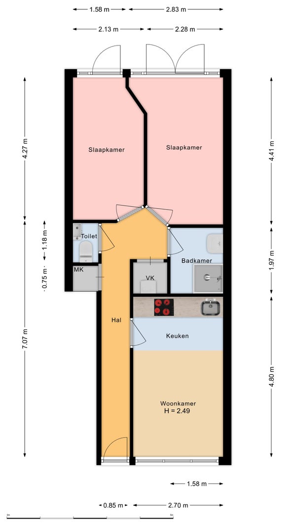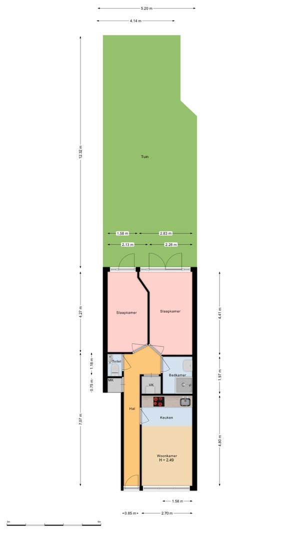 - Entree/hal met meterkast en toegang tot de vertrekken;
