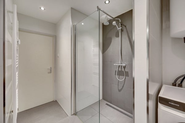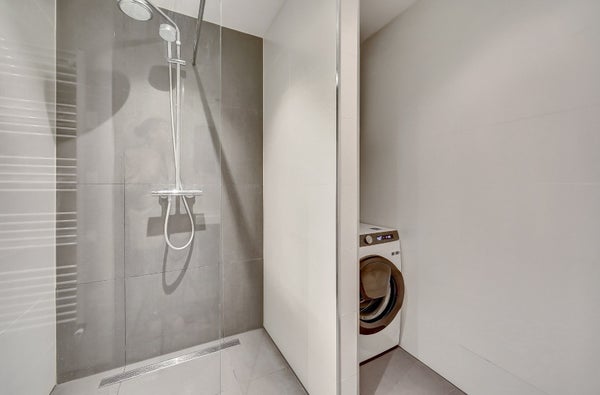 De luxe badkamer is volledig betegeld en voorzien van een royale inloopdouche met regen- en handdouche, een breed wastafelmeubel met dubbele kraan, een extra brede spiegel én aansluitingen voor wasmachine, droger en boiler.