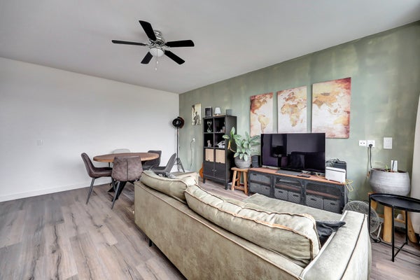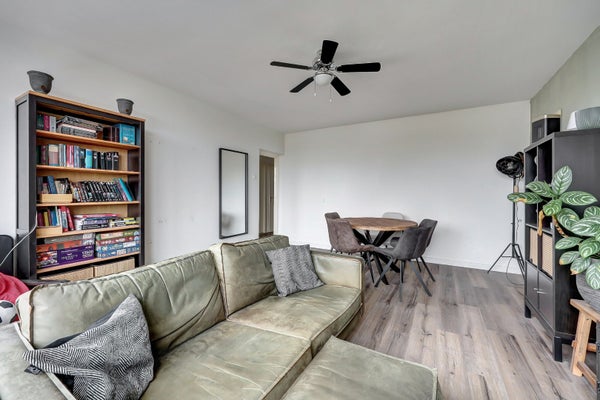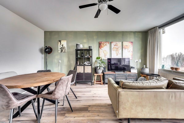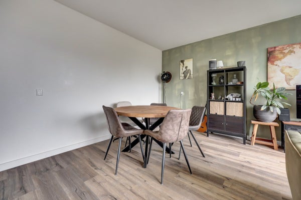 De lichte woonkamer ligt aan de achterzijde en valt direct op door de prettige lichtinval. De laminaatvloer, strak gestucte wanden en het nette plafond zorgen voor een verzorgde uitstraling.