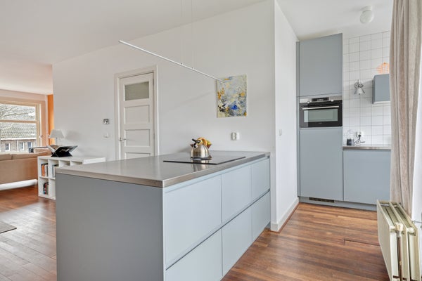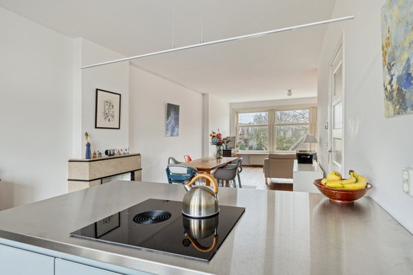 Op de tweede verdieping vindt u een uitzonderlijk ruime woonkamer van 40m² met veel natuurlijk licht. De moderne open keuken is in keurige staat met schier-kookeiland voorzien van Bora inductiekookplaat met geïntegreerde afzuiging, keukenunit met vaatwasser, wasbak, koelkast, vriezer, combi magnetron en deur naar balkon aan de achterzijde. Het biedt een uitnodigende plek om te koken en samen te zijn met vrienden of familie.