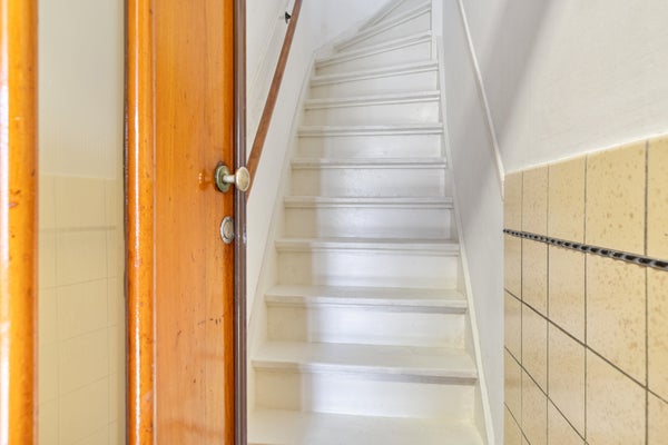 Entree via het open portiek naar de eerste verdieping. Daar leidt de woningentree met een trap naar de 2e verdieping.