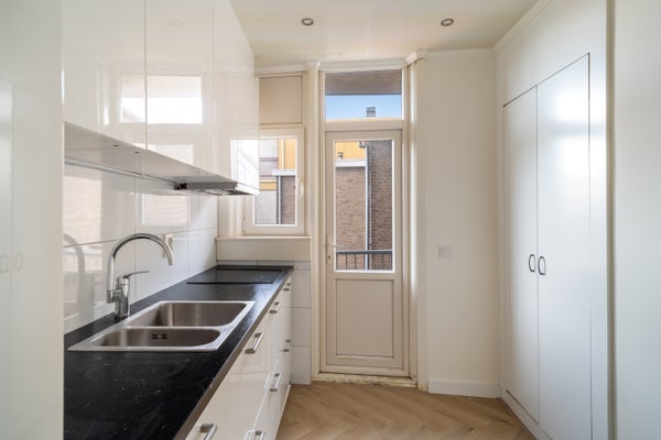 - De keuken met een keukenblok in rechte opstelling is voorzien van een inductiekookplaat, afzuigkap, koel/- vriescombinatie, magnetron, vaatwasser en oven. Vanuit de keuken heeft u toegang tot het balkon en de berging met CV-opstelling;