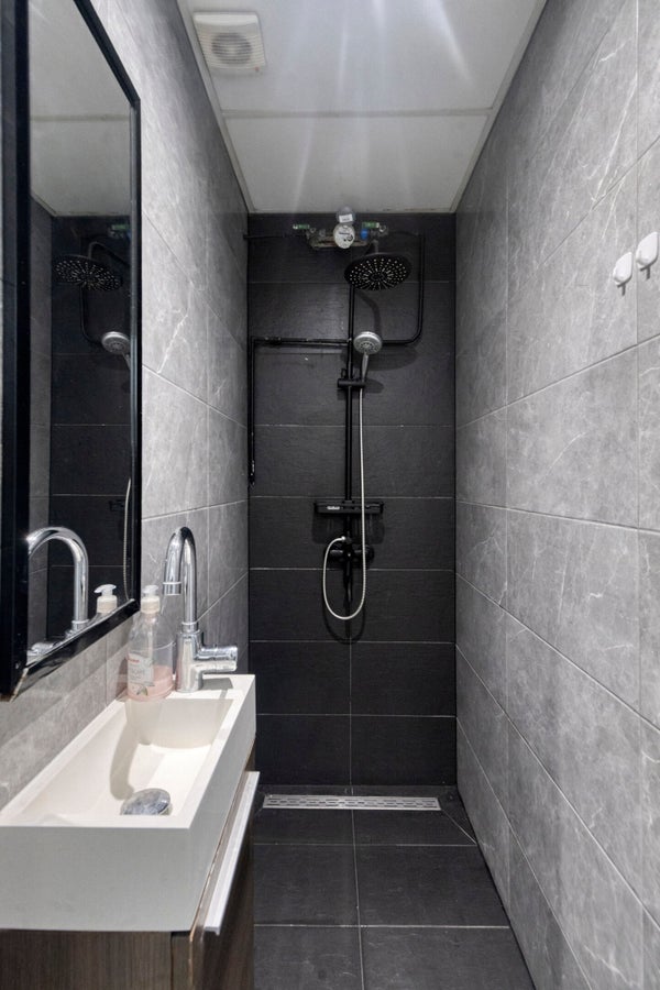 • De nette geheel betegelde badkamer is voorzien van een douche en een wastafelmeubel;