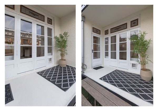 De lichte en ruime woonkamer is aan de achterzijde gelegen en beschikt over openslaande deuren naar de achtertuin. Vanuit de woonkamer is er mooi zicht op de diepe achtertuin en het riante terras. Via de klassieke tuindeuren met glas-in-loodbovenramen stap je op het beschutte terras, waar je al vroeg in het seizoen in de ochtendzon kunt genieten van je eerste kop koffie.