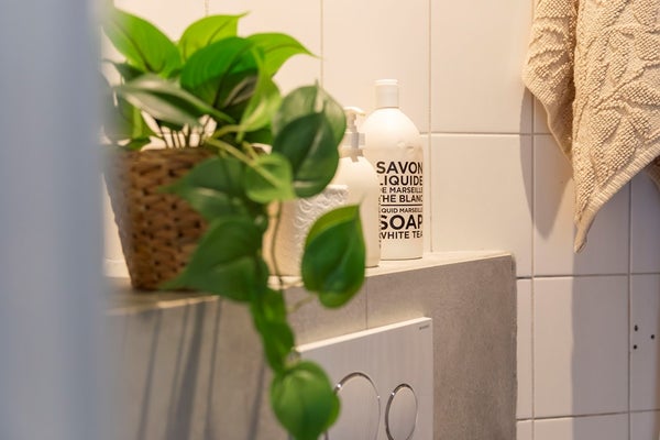 De badkamer is netjes betegeld en beschikt over een douchehoek en een toilet.
