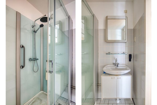 Aan de achterzijde van de woning vind je de eerste slaapkamers. Een comfortabel slaapkamers met voldoende invallicht. De badkamer beschikt o.a. over een ruime douchecabine met afsluitbare glazenschuifdeuren en een wastafel. Terug in de hal vind je naast de badkamer een separaat toilet met fonteintje, en een afgesloten voorraadkast met de wasmachineaansluiting. Ook de meterkast is hier te vinden.