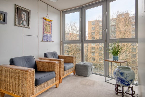 - De galerijflat heeft een woonoppervlakte van 87 m² en beschikt over 3 kamers, waarvan 2 slaapkamers;