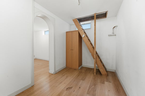 De tweede slaapkamer op de 1e verdieping heeft een trap naar het souterrain. Souterrain, ruime hal met eventueel ruimte voor extra bergruimte. Toegang tot de berging en ruime (slaap)kamer.