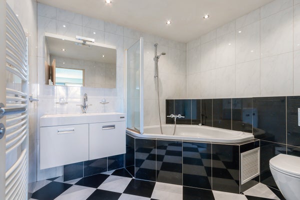 hoekbad-/douche combinatie, 2de toilet, radiator, en dubbele wasbak.