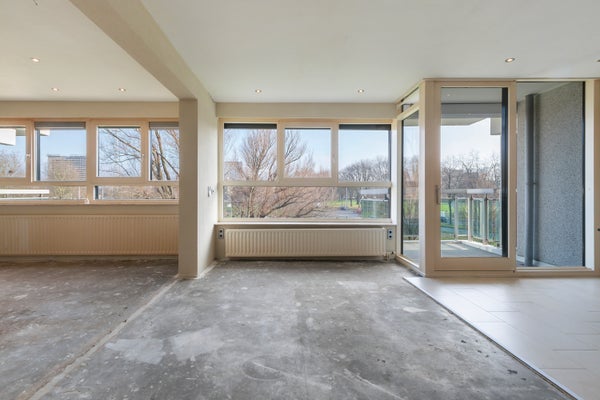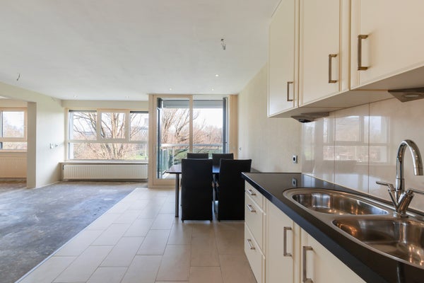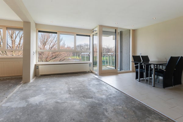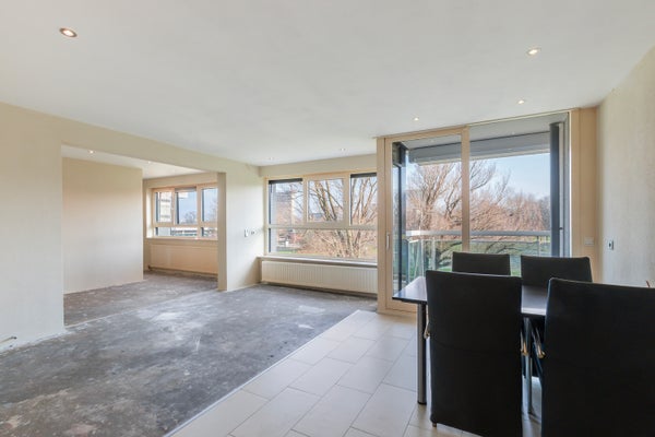 Brede woon-/eetkamer (4.60 x ca. 5.00) met toegang tot het op het Zuid-Oosten gelegen balkon (2.60 x 2.07).