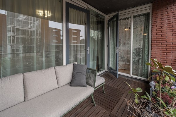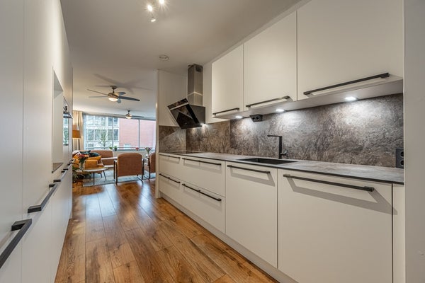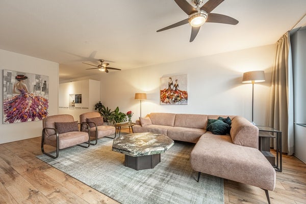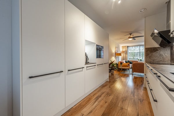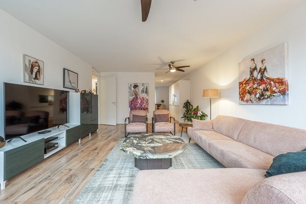Aan de linkerzijde van de woning ligt de royale woonkamer. Deze lichte en sfeervolle ruimte biedt volop plek voor een grote zithoek en staat in directe verbinding met het balkon. Dankzij de grote raampartijen is dit een fijne plek om te ontspannen. Aan de achterzijde van de woonkamer zijn screens aanwezig, waardoor je op warme dagen de zon eenvoudig kunt weren en het binnenklimaat aangenaam blijft.