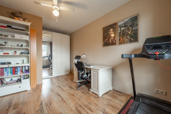 De tweede slaapkamer ligt aan de voorzijde en is uitstekend te gebruiken als kinder-, werk- of logeerkamer.