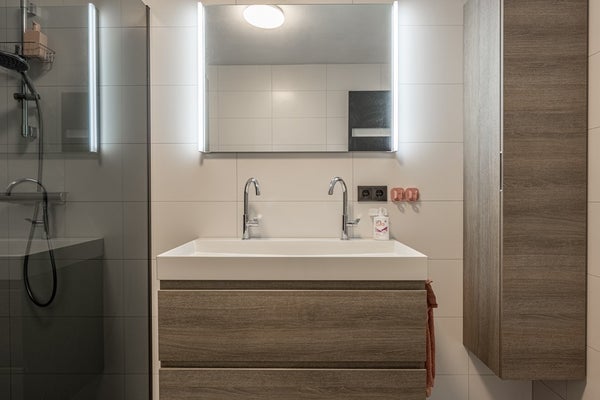 De badkamer, bereikbaar vanuit de hal, is in 2018 vernieuwd en zeer luxe en hoogwaardig afgewerkt. De ruimte is voorzien van een inloopdouche, een wastafel in meubel met spiegel en een handdoekradiator, wat zorgt voor een hotelwaardige uitstraling en optimaal comfort.
