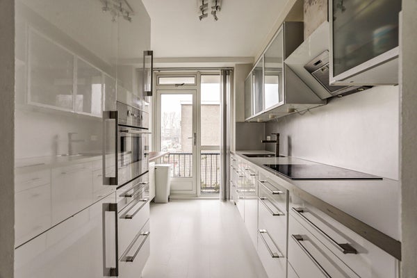 De keuken is praktisch ingericht met een rechte opstelling en een kastenwand aan de overzijde, voorzien van een koel-/vriescombinatie, combi-oven en veel bergruimte. Daarnaast beschikt de keuken over diverse inbouwapparatuur, waaronder een keramische kookplaat, afzuigkap en vaatwasser. Ook vanuit de keuken heeft u toegang tot het balkon aan de achterzijde.