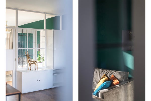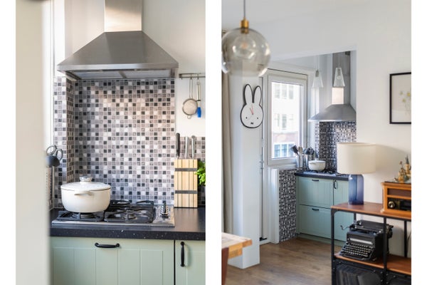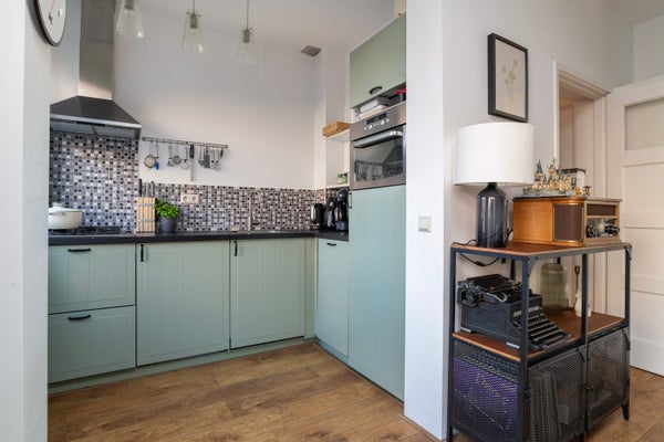 Woonkamer (4.86 x 3.58), voorzien van originele suite-separatiekasten en open keuken