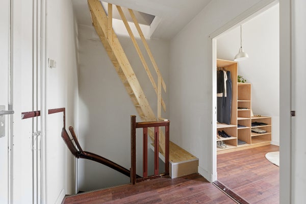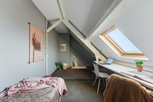 Op de overloop is een compacte trap die toegang geeft tot de halve zolder met daglicht, mooie openruimte die voor diverse doeleinden gebruikt kan worden.