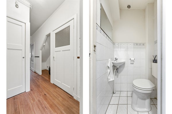 2e verdieping, twee fijne slaapkamers en ruime badkamer met 2e toilet, douchehoek, wastafel met meubel en opstelplaats voor de wasmachine en droger. In de grote slaapkamer is een vaste kast met de opstelplaats voor de cv-ketel.