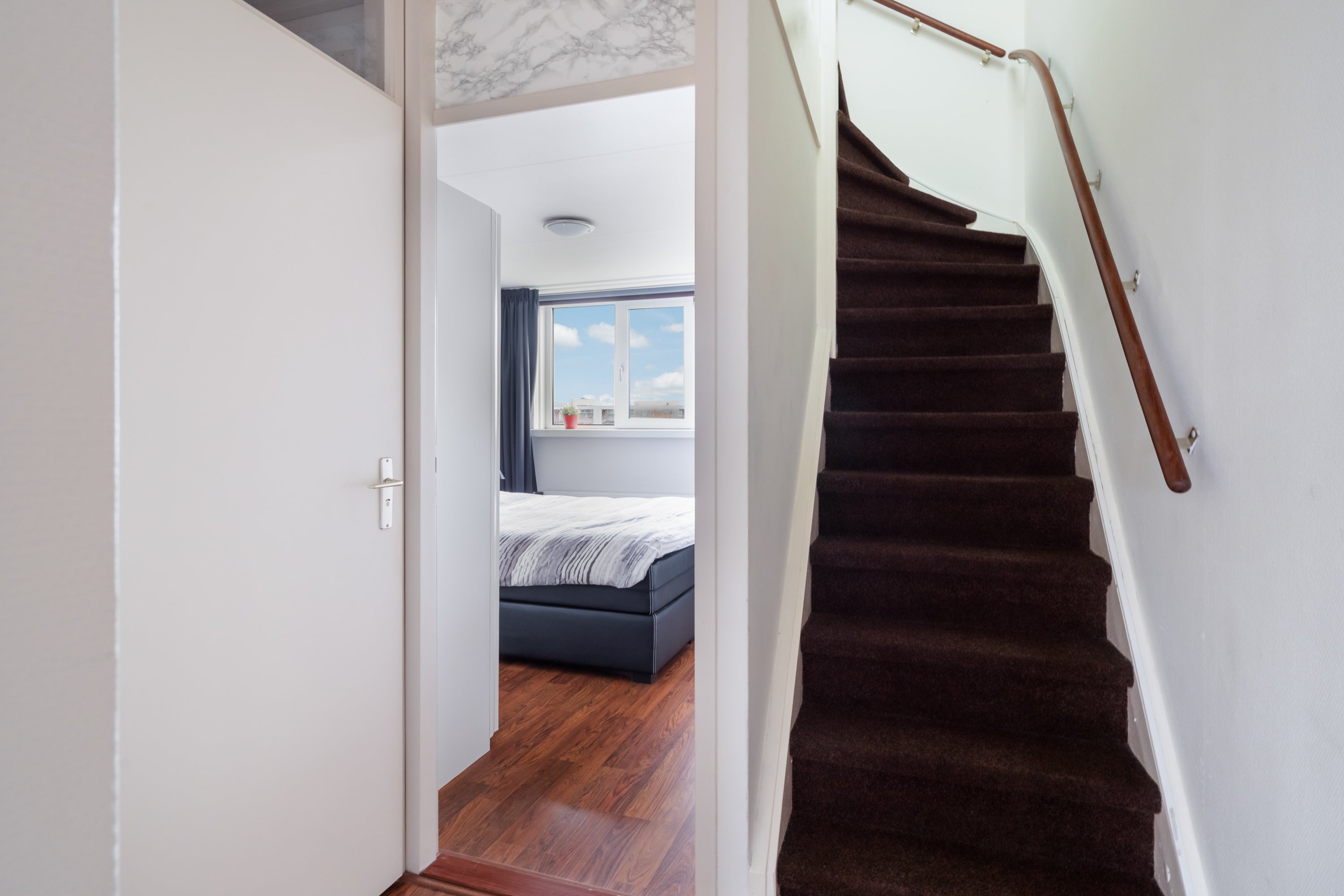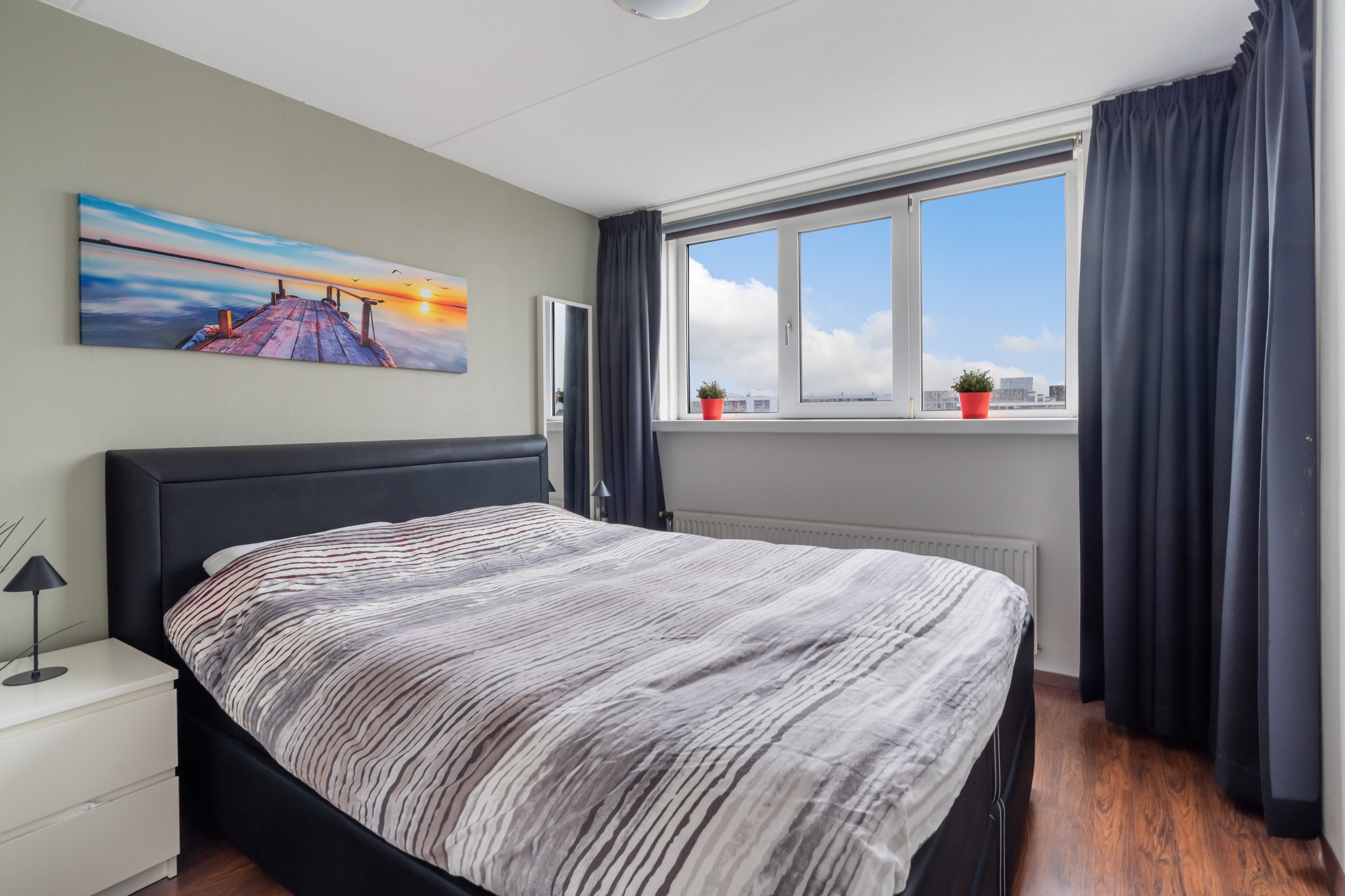 Bij binnenkomst op de bovenste woonlaag vind je een lichte slaapkamer van 9m2 en een inloop-/garderobekast. Via een vaste trap bereik je de 6de etage met een ruime woonkamer van 25m2, die toegang biedt tot een balkon op het westen. De open keuken heeft moderne apparatuur, waaronder een 4-pits kookplaat en vaatwasser. Daarnaast is er een slaapkamer van ca. 12m2 en een moderne badkamer met inloopdouche. Het appartement heeft een eigen berging, wordt "gasloos" verwarmd en heeft energielabel A. Er is een actieve VvE met een bijdrage van € 163,- per maand.
