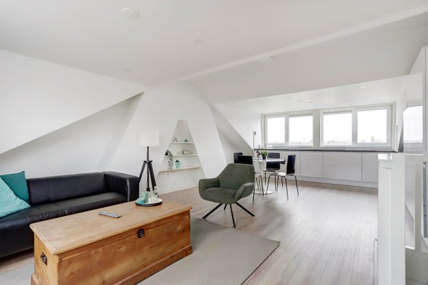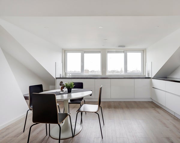 De vierde verdieping bevat een lichte woonkamer met een moderne open keuken, beide profiterend van veel natuurlijk licht door dakkapellen. De woning is energiezuinig met dubbel glas, centrale verwarming, en heeft een gunstig energielabel (C).