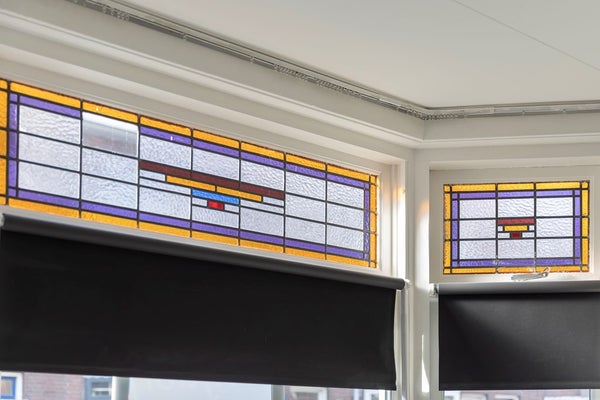 De overloop leidt naar de fijne slaapkamer. Ook hier is dezelfde nette afwerking te vinden als in de rest van de woning, met sfeervolle glas-in-loodbovenramen.