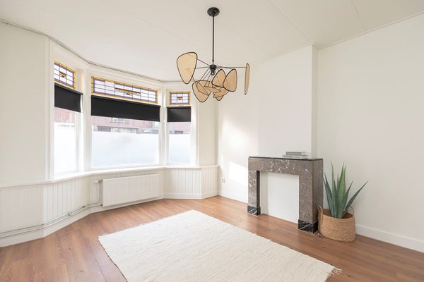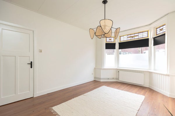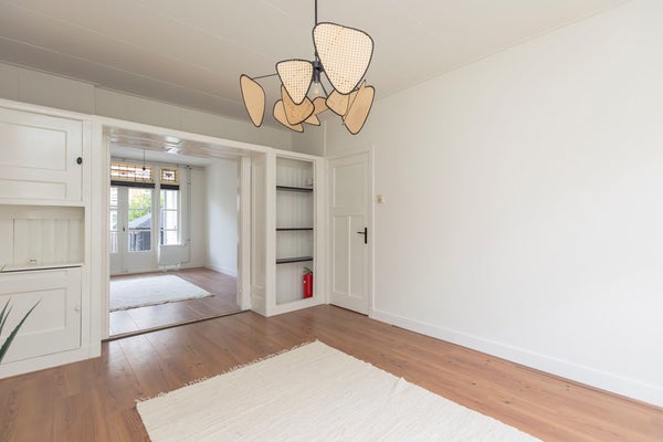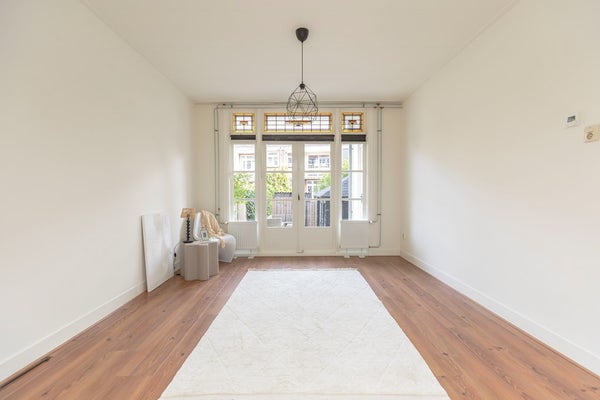 De lichte en ruime woonkamer is aan de achterzijde gelegen en beschikt over openslaande deuren naar de achtertuin. Vanuit de woonkamer is er mooi zicht op de diepe achtertuin en het riante terras. Via de klassieke tuindeuren met glas-in-loodbovenramen stap je op het beschutte terras, waar je al vroeg in het seizoen in de ochtendzon kunt genieten van je eerste kop koffie.