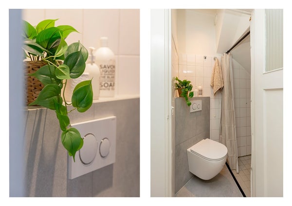 De badkamer is netjes betegeld en beschikt over een douchehoek en een toilet.