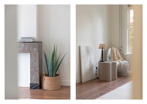 Het tochtportaal is nog voorzien van de originele betegeling. De binnendeuren zijn uitgevoerd met panelen en er zijn marmeren schouwen aanwezig.