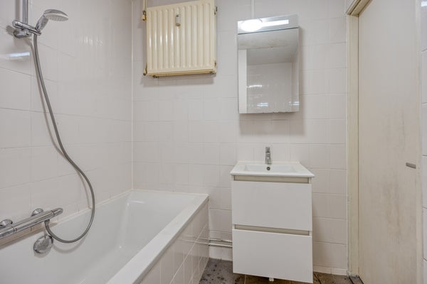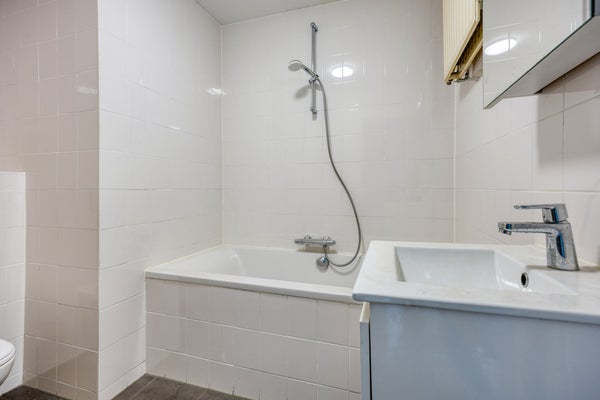 - De nette badkamer (ca. 2.70m x 1.91m) is voorzien van een wandcloset, een wastafelmeubel, een ligbad, een thermokraan en een douchecombinatie. De gehele badkamer is betegeld en is in 2022 vernieuwd;