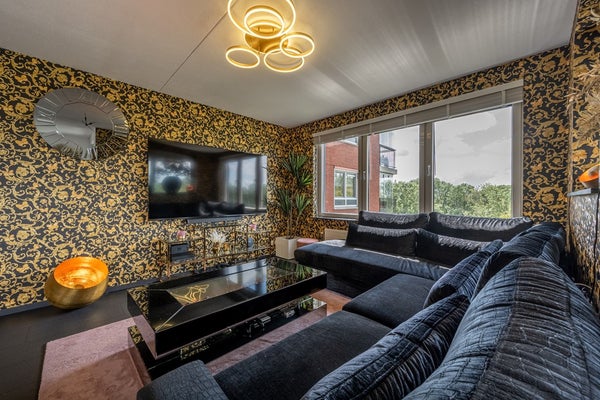 De royale L-vormige woonkamer is heerlijk licht dankzij de grote kunststof raampartijen met HR++ glas en biedt een prachtig uitzicht over de omliggende waterpartijen. De sfeervolle gashaard maakt het woongenot compleet. De nette laminaatvloer geeft het geheel een moderne uitstraling.