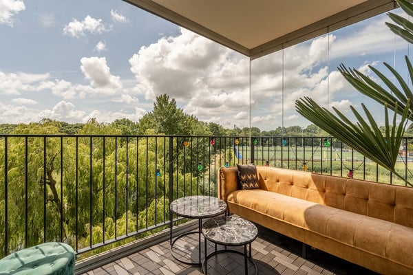 Via de woonkamer bereik je het westelijk gelegen balkon, dat is voorzien van afsluitbare glazen panelen. Zo geniet je het hele jaar door – zelfs in de winter – van het buitenleven en het uitzicht.