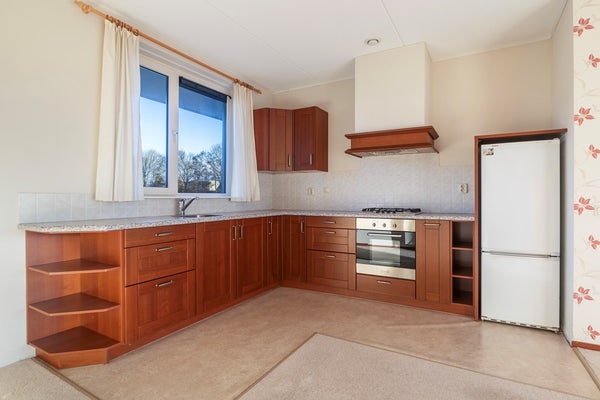De woonkamer is opvallend ruim en licht, met grote raampartijen en een directe verbinding naar het balkon. Hier geniet je van een vrij uitzicht en volop privacy. Er is meer dan genoeg plek voor een royale zithoek én een grote eettafel. De open keuken in hoekopstelling sluit mooi aan op de woonkamer en is praktisch ingedeeld, met voldoende werk- en kastruimte. Een fijne plek om te koken en tegelijkertijd in contact te blijven met je gasten.