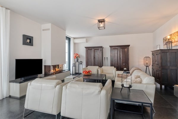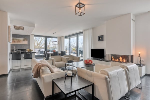 Vanuit de hal komt u de living binnen middels een moderne taatsdeur. Direct bent u onder de indruk van de luxe uitstraling en lichte ruimte. De living is afgewerkt met een luxe betegelde vloer, gestucte wanden en een gestuct plafond. De living is voorzien van een gashaard voor de koude winterdagen en airconditioning horren en elektrische op afstand bestuurbare screens voor de warme zomerdagen. Vanuit de living is er toegang tot het riante dakterras middels twee luxe schuifpuien en een openslaande tuindeur.