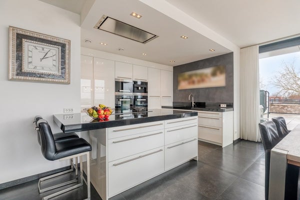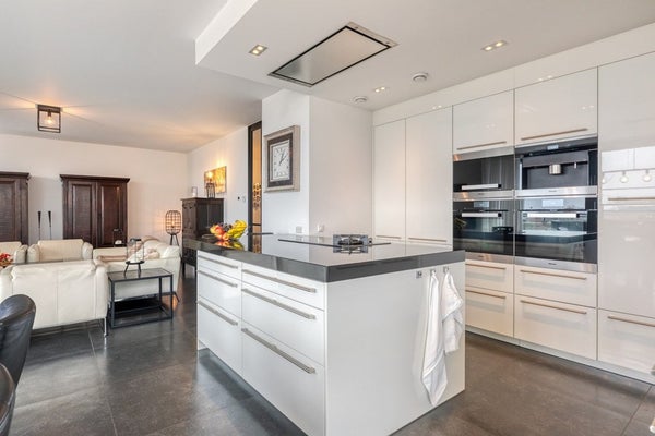 De moderne open keuken is afgewerkt met een betegelde vloer, gestucte wanden en een gestuct plafond met inbouwverlichting. De luxe keukeninrichting (Poggenpohl maatwerk inbouwkeuken) is voorzien van een hoogwaardig granieten keukenblad, spoelbak, koel-/vriescombinatie, 2 elektrische ovens, koffieautomaat, hoge druk stoomoven, vaatwasser, afzuigkap en een kookeiland voorzien van een inductiekookplaat met separate wokbrander (gas).