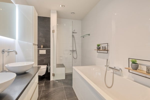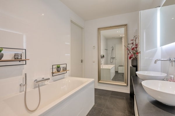 Uw eigen vijfsterrenbadkamer! Het ligbad, de Sunshower en vloerverwarming zorgen voor een ultiem hotelgevoel, elke dag opnieuw. De moderne badkamer is afgewerkt met een betegelde vloer, betegelde wanden een gestuct plafond. De badkamer is voorzien van een ligbad, inloopdouche met Sunshower (infrarood) en zitbankje (incl. vloerverwarming) , 2e toilet, badkamermeubel met dubbele wastafel.