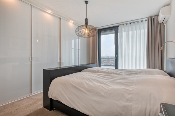 Slaapkamer 1 is afgewerkt met een tapijt vloer, gestucte wanden en een gestuct plafond. De slaapkamer is voorzien van een inbouwkastenwand, airconditioning en biedt toegang tot het dakterras.