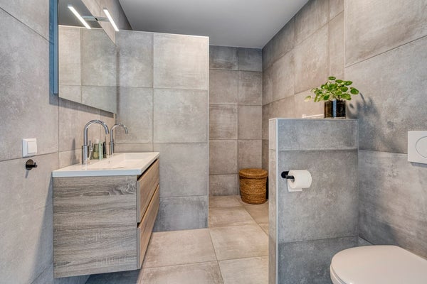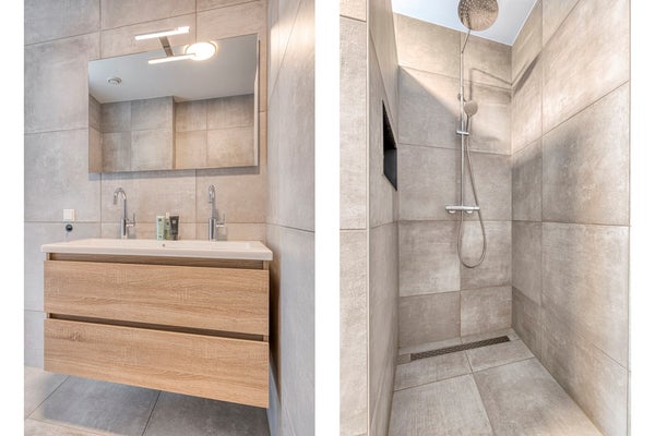 De badkamer is modern en volledig betegeld en voorzien van een inloopdouche, een dubbel wastafelmeubel, handdoekenradiator en toilet. De afwerking is netjes en tijdloos.