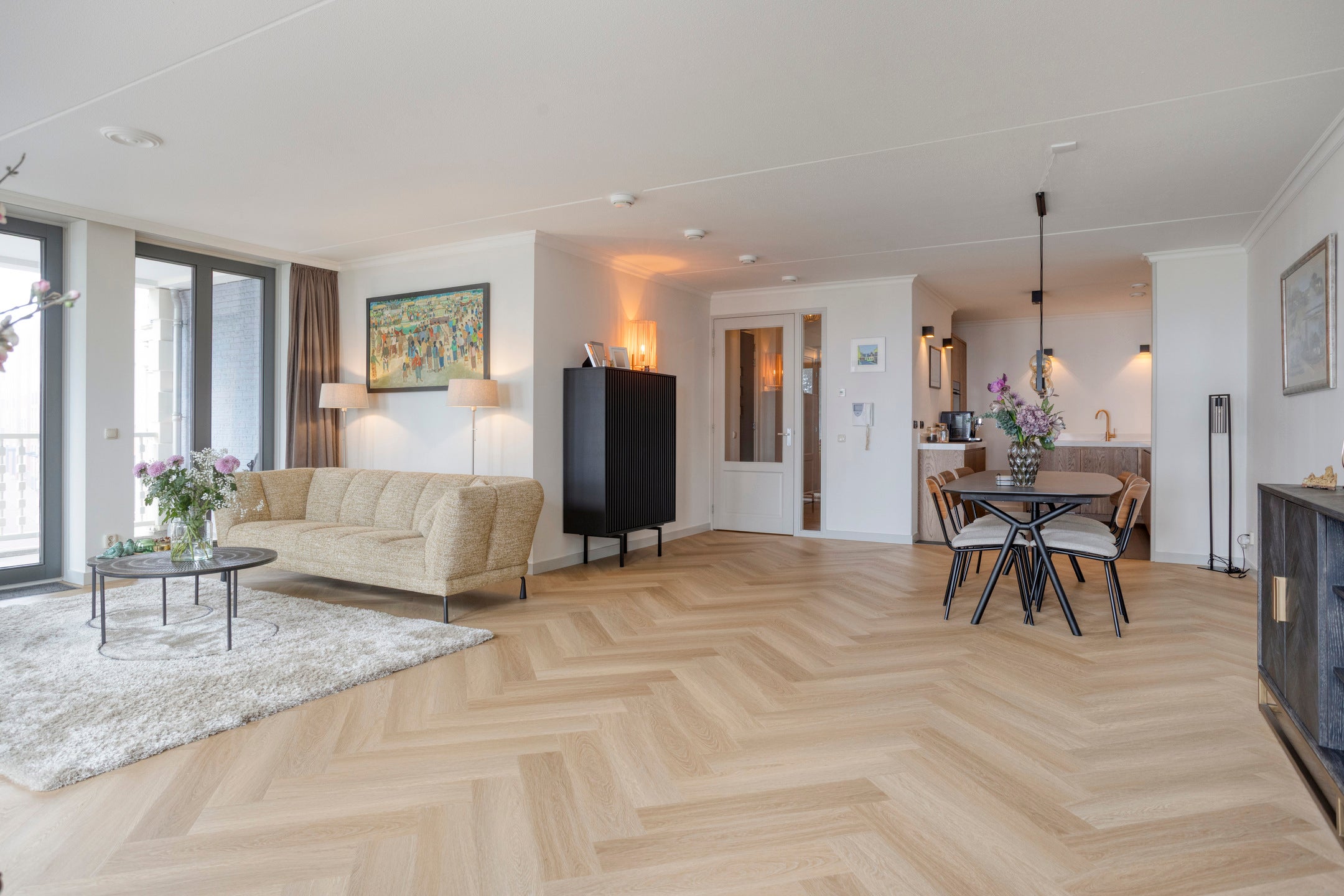 Binnenkomend via de lift of trap, arriveert u op de eerste verdieping. De lichte woonkamer met grote raampartijen geeft toegang tot een zonnig balkon. De open keuken is vernieuwd met massief eiken en Bosch-apparatuur. Daarnaast zijn het toilet en de badkamer recent gerenoveerd.