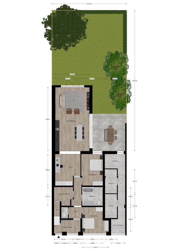 - De benedenwoning heeft een woonoppervlakte van 123 m² en beschikt over 3 kamers, waarvan 2 slaapkamers;