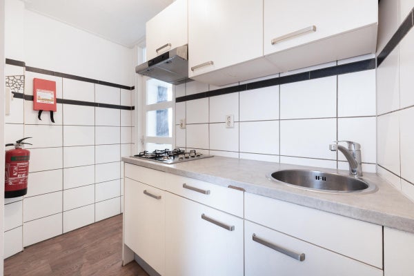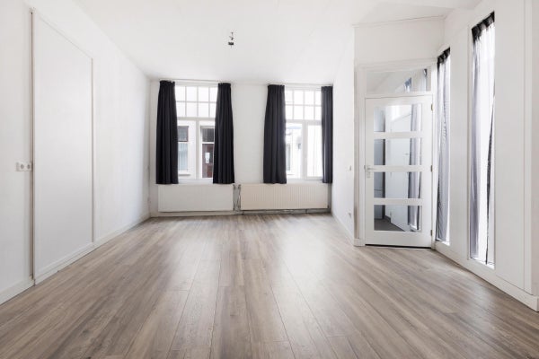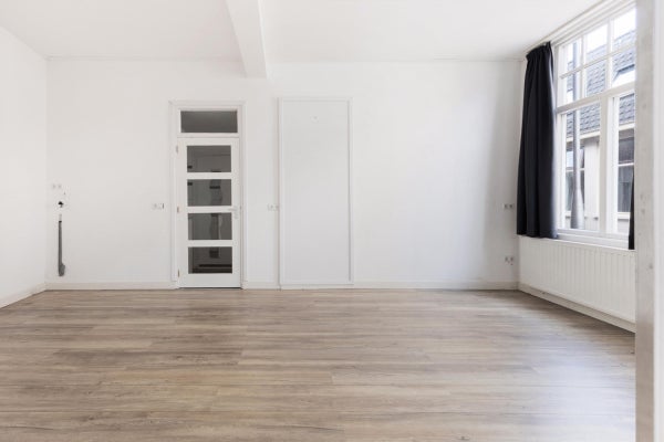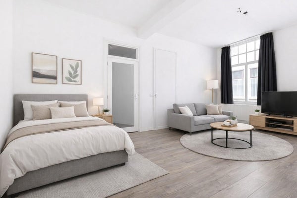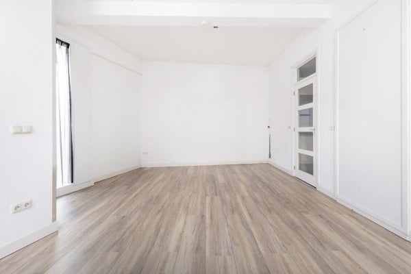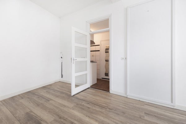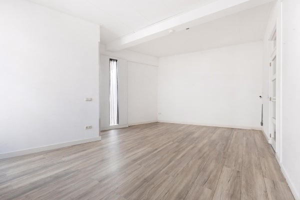 De woning beschikt over een lichte woonkamer die momenteel tevens als slaapruimte fungeert. Dankzij het hoge plafond is het hier zelfs mogelijk om een leuke vide te realiseren, waardoor je extra ruimte en een speelse indeling creëert.
