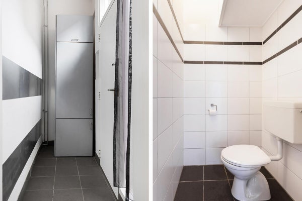 Via de hal betreed je de woning. Vanuit hier bereik je de lichte woonkamer, die momenteel als woon- en slaapruimte wordt gebruikt. Door de hoge plafonds zijn hier diverse indelingsmogelijkheden, zoals het creëren van een aparte slaapkamer of het realiseren van een vide.