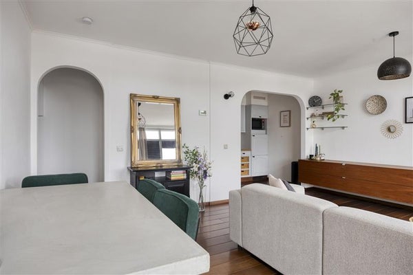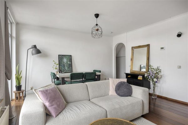 Bij binnenkomst tref je direct de massieve houten vloer, die warmte en karakter brengt in elke ruimte. De woonkamer, gelegen op een hoger niveau, is knus en licht tegelijk. Met 22 m² biedt deze plek voldoende mogelijkheden voor een gezellige zithoek en een stijlvolle eethoek. Vanaf hier loop je zo het balkon op, gelegen op het oosten.
