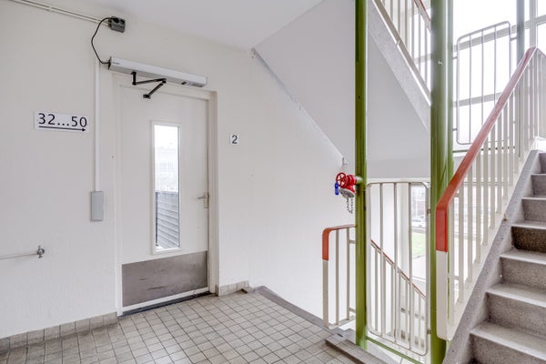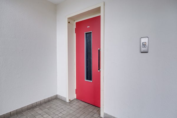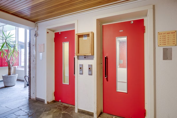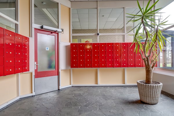 Centrale entree met bellentableau en intercominstallatie. Via de lift en het trappenhuis zijn de woonverdiepingen en de bergingen in de onderbouw bereikbaar.
