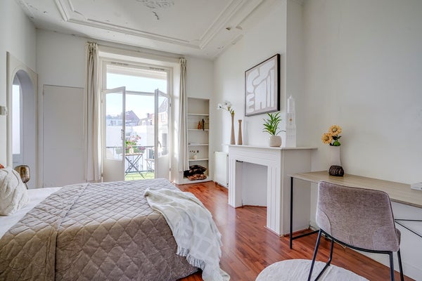 Via authentieke ensuite deuren bereik je het slaapvertrek. Deze is aan de achterzijde van het appartement gelegen, wat zorgt voor een rustige en aangename slaapomgeving. De kamer is ruim van opzet, waardoor er eenvoudig een combinatie van slaap- en werkruimte kan worden gecreëerd. In het appartement zijn op meerdere plekken inbouwkasten aanwezig, waaronder in de slaapkamer – ideaal voor het opbergen van kleding en andere spullen. Vanuit het slaapvertrek geven openslaande deuren toegang tot het balkon, dat over de volledige breedte van het appartement loopt en een uitstekende zonligging heeft. Hierdoor kun je in de middag heerlijk van de zon genieten. Op het balkon bevinden zich twee ingebouwde kasten. In één daarvan zijn de cv-ketel en de aansluitingen voor de wasmachine gesitueerd.