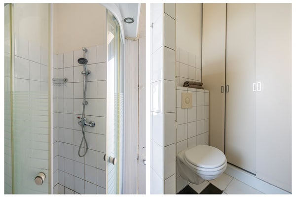 De badkamer is eveneens aan de achterzijde gelegen en beschikt over een douchecabine, een wastafel met meubel en een apart toilet. Daarnaast is er van vloer tot plafond een royale inbouwkast gerealiseerd, ideaal voor het opbergen van wasgoed en andere benodigdheden.